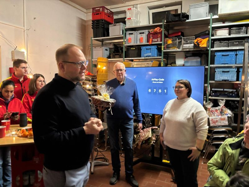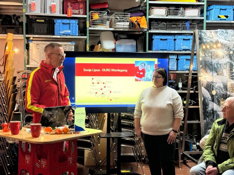 Der Stützpunkt der DLRG ist an diesem Abend kaum wiederzuerkennen: Kerzen, Clementinen, Gebäck und das leise Stimmengewirr von mehr als 50 Menschen füllen den sonst funktionalen Einsatzraum. Zwischen Bootsausrüstung, Westen und Kisten laufen auf einem Fernsehmonitor Szenen der Hamburger Preisverleihung – Videobotschaften, Laudationen, Rückblicke. Doch im Mittelpunkt steht nicht die große Bühne, sondern die Rückkehr einer Frau, die seit Jahren wirkt, ohne sich vorzudrängen: Sonja Lipus (47).